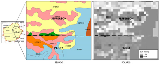 Developed by the Natural Resources Conservation Service (NRCS), SSURGO offers a comprehensive repository of soil information across the United States [33,34]. This extensive dataset consolidates soil data gathered over more than a century by the National Cooperative Soil Survey, employing field surveys to observe soil properties and collect samples for laboratory analysis. Such a detailed approach ensures the reliability and thoroughness of the data. SSURGO integrates both spatial and tabular data into soil map units, delineating areas with distinctive soil characteristics. Each map unit encompasses one to three predominant soil types, along with minor components, and provides detailed attributes, including available water capacity, soil pH, electrical conductivity, and land-use limitations. The database spans the entire United States, including various territories and commonwealths, and offers data at scales ranging from 1:12,000 to 1:63,360 [34]. The level of detail in the data varies with the complexity of the soil conditions in different regions. However, the dataset is not without limitations. It exhibits artificial discontinuities at governmental boundaries and gaps in geographic coverage across the United States [35,48]. Additionally, SSURGO typically presents soil data with a varying number of layers within contiguous areas, often lacking uniform layer depths, which can impact the precision of soil assessments. Figure 3 illustrates SSURGO soil areas along the border between Jefferson and Perry counties in the BMW, highlighting areas where soil properties exhibit discontinuities despite following smooth contours across the county line. For instance, the Mukey code 1540456 (green) soil in Jefferson County has four layers at depths of 0.13, 0.30, 0.91, and 1.52 m, with respective densities of 1.50, 1.78, 1.78, and 1.65 Mg/m3, and hydraulic conductivities of 10.15, 0.76, 0.76, and 3.28 mm/h. In contrast, the Mukey code 1405423 (orange) soil in Perry County also features four layers at depths of 0.23, 0.71, 1.63, and 1.98 m, with densities of 1.45, 1.50, 1.65, and 1.68 Mg/m3, and hydraulic conductivities of 33.01, 10.15, 0.76, and 3.28 mm/h.
