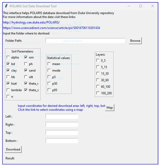 The POLARIS soil database was accessed and downloaded from the repository at http://hydrology.cee.duke.edu/POLARIS/PROPERTIES/v1.0/, accessed n 05 August 2024. Four data tiles were downloaded to encompass the full extent of the BMW, covering a geographic range from −90° to −88° W longitude and from 37° to 39° N latitude. Within this specified area, raster datasets of mean values were acquired for eight key soil properties, including bulk density (g/cm3), organic matter content (%), saturated hydraulic conductivity (cm/h), soil texture (percent clay, silt, and sand), residual water content (), and saturated water content () in m3/m3. These datasets were extracted across the six available soil layers. The data retrieval was efficiently conducted using the “POLARIS Soil Data Download” tool, designed for rapid and reliable access to POLARIS data (Figure 4). This process yielded 32 raster files, with four tiles for each of the eight soil properties, representing the respective soil layers. The tool’s Python code, along with an executable version, is available at https://github.com/noayarae/POLARIS_Soil_Data_Download_Tool/tree/main, accessed on 28 October 2024.