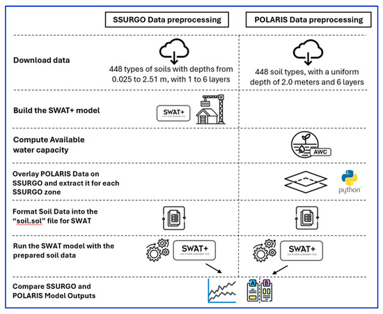 Finally, the enriched POLARIS database was reformatted to meet the requirements of the SWAT model. This prepared dataset was then integrated into the SWAT model framework for subsequent execution and analysis with the POLARIS data. The schematic diagram of the methodology involved in the study is shown in Figure 5.