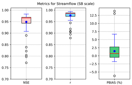 The metrics (NSE, PBIAS, and r) were visualized using box plots to provide a comprehensive statistical summary. These plots included the mean, Quartile 1 (Q1, the 25th percentile), Quartile 2 (Q2, the median or 50th percentile), and Quartile 3 (Q3, the 75th percentile), effectively capturing the central tendency and spread of the data. The interquartile range (IQR), calculated as IQR = Q3 − Q1, represents the spread of the middle 50% of the data. The whiskers extend to capture variability outside the interquartile range and are defined based on the IQR, with the lower fence set at max(Q1 − 1.5 × IQR, min(data)) and the upper fence set at min(Q3 + 1.5 × IQR, max(data)). These fences delineate the “typical range” of the data, ensuring a robust representation of the dataset and highlighting potential outliers beyond these boundaries [60]. The “range of typical data” is bounded by the lower and upper fences, representing the expected variation within the dataset.