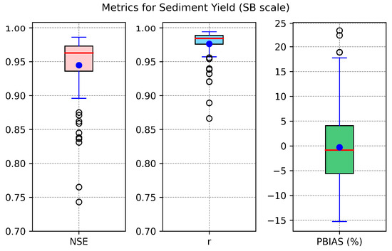 In sub-basin #11, the range of typical NSE values varied from 0.718 to 0.987 (mean = 0.892, SD = 0.077), indicating moderate to high agreement between both soil datasets. The range of typical r spanned 0.912 to 1.00 (mean = 0.967, SD = 0.023), showing strong consistency. The range of typical PBIAS values ranged from −65.99% to 39.85% (mean = −6.19%, SD = 22.62%), with outliers primarily at the lower end. The extended lower whisker suggested that POLARIS-based sediment yield estimates are often lower than SSURGO-based estimates.