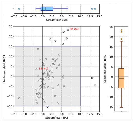 Simultaneous evaluation of PBIAS comparing the POLARIS- and SSURGO-based model outcomes for the streamflow (with a light blue box plot at the top) and sediment yield (with an orange box plot at the right side) at the sub-basin scale. The shaded gray box marks the ‘very good’ agreement range: for the streamflow and for the sediment yield. Seventy-two of the eighty-one sub-basins (88.9%) fell within this range.