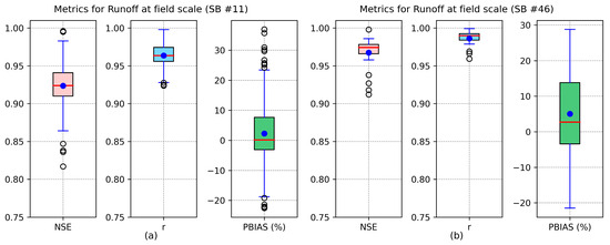 Figure 9 presents the performance metrics (NSE, r, and PBIAS) for comparing the runoff simulations using the SSURGO and POLARIS soil datasets at the field scale. The analysis focused on two sub-basins, #11 (184 HRUs) and #46 (24 HRUs), chosen to highlight contrasting levels of similarity between the two soil datasets at the sub-basin level. Sub-basin #11 exhibited a high similarity between the SSURGO and POLARIS data, whereas sub-basin #46 showed less agreement.