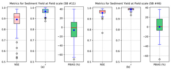 Figure 11 illustrates the scatter and box plots of the PBIAS values for the streamflow and sediment yield at the field scale, evaluated across HRUs in sub-basins #11 and #46, using the POLARIS and SSURGO soil datasets. The shaded region indicates the “very good” performance range: and . For sub-basin #11, 79 out of 184 HRUs (42.9%) met this range, while sub-basin #46 had a lower proportion, with 8 out of 24 HRUs (33.3%) achieving the same criteria.