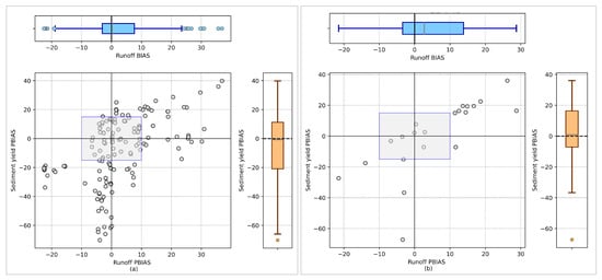 Evaluation of the PBIAS comparing the POLARIS- and SSURGO-based model outcomes for streamflow (with a light blue box plot at the top) and sediment yield (with an orange box plot at the right side) at the field scale. The shaded gray box indicates ‘very good’ agreement: for the streamflow and for the sediment yield. In sub-basin #11 (a), 42.9% of HRUs (79/184) met this range, while in sub-basin #46 (b), 33.3% (8/24) did.