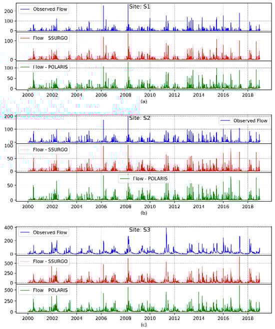 Comparing the performance of the two soil databases, POLARIS outperformed SSURGO at sites S3, S5, and S6, whereas SSURGO produced more accurate simulations at S1, S2, and S4. Figure 12 displays the observed data and the corresponding simulated streamflow for all six sites, using both soil datasets.