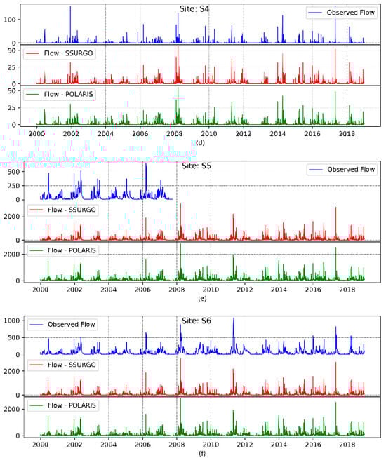 Observed and simulated streamflow using POLARIS and SSURGO soil data at six BMW sites: (a) S1, (b) S2, (c) S3, (d) S4, (e) S5, and (f) S6.