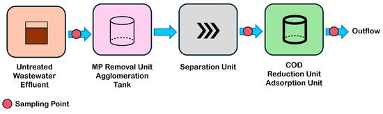 Industrial wastewater, particularly from plastic production, manufacturing, or recycling industries, is often highly polluted with MPs and high levels of oxidizable organic matter, which creates a high chemical oxygen demand (COD) [8]. The presence of industrial wastewater in municipal WWTPs imposes a substantial burden due to the MP load [9].