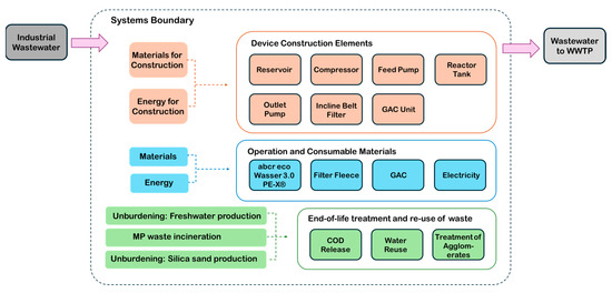 This paper investigates a practical case study of industrial wastewater treatment scenarios based on wastewater from a plastic manufacturer in Germany. It evaluates the environmental impacts associated with the implementation of a pilot system for MP and COD removal, which is based on physicochemical agglomeration–fixation using organosilanes followed by COD removal by adsorption. The assessment considers the environmental impacts across the complete life cycle of the treated wastewater, from its entry to the treatment system to the disposal of all waste streams. This is followed by a comparative assessment of the currently operational pilot plant and an optimized scenario with a sustainable upgrade, with the aim of determining the benefits of eliminating key drivers of environmental burdens and incorporating waste reuse schemes.