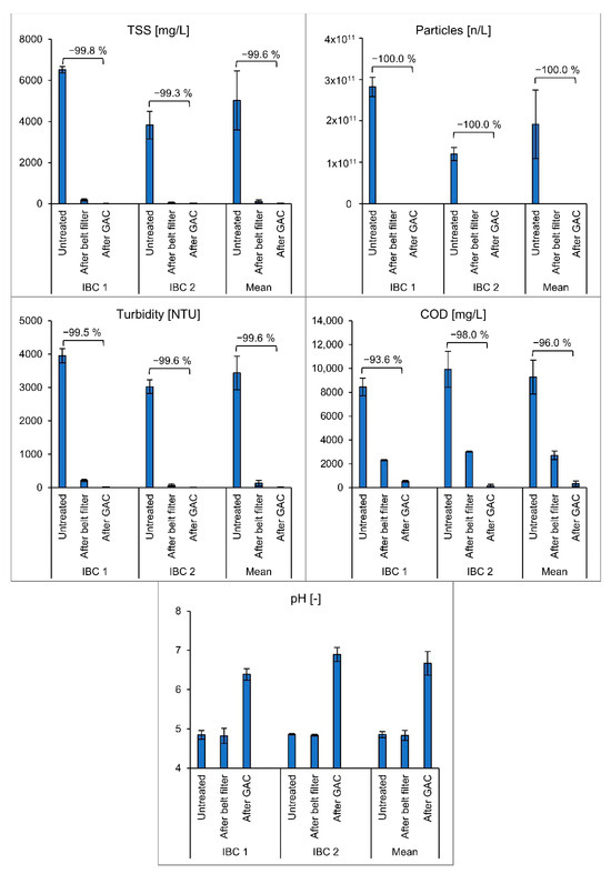 All samples were analyzed for pH value, COD (DIN ISO 15705-H45) [38], particle count, total suspended solids (TSSs, DIN 38 409-H2-2) [39], and turbidity (DIN EN ISO 7027) [40].