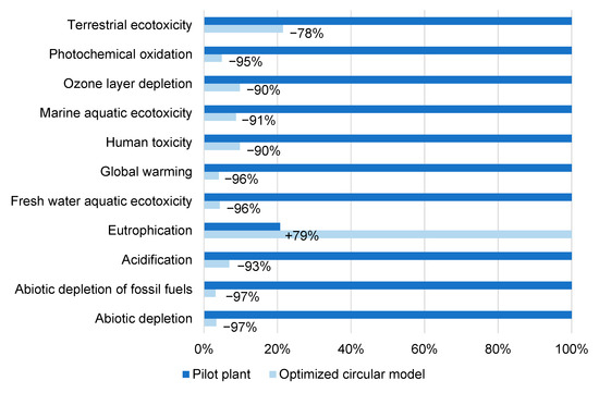 The pilot plant scenario assumes that the final separated and dried solid waste is incinerated. To avoid disclosing data from the plastic manufacturer, an incineration process of waste polyethylene terephthalate was used as an estimation. The incineration process of plastic waste itself brings both burdens and benefits in terms of environmental impacts, where the benefits of energy recovery are often outweighed by the generated emissions, as shown by the LCA results reported in previous works [50]. The benefits in this scenario were modeled on the assumption of energy recovery for electricity production at an efficiency of 35% while replacing the German electricity mix, which is in large part comprised of fossil sources, such as coal and natural gas [51].