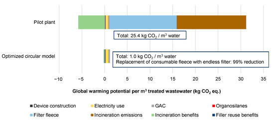 The results of the study can be contextualized by roughly comparing them to previously reported results based on LCAs of wastewater treatment methods. A review of scenarios to improve tertiary treatment in developing countries showed that water reuse, as a result of additional treatment stages, had benefits in terms of environmental impacts, where the GWP was reduced by 0.046 kg CO2/m3 in treated wastewater as a result of avoided impacts of tap water production [55]. An assessment of MP impacts on the environment found that released MPs could have significant impacts on the potential loss of species diversity [56], which aligns with the conclusion of our study, where environmental effects are based on physical effects on biota. When performing such comparisons, it is important to note that LCA results among different studies are highly variable based on the selected system boundaries, impact assessment methods, and considered data variables.