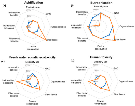 Breakdown of individual process impacts on evaluated impact categories: (a) acidification, (b) eutrophication, (c) freshwater aquatic ecotoxicity, and (d) human toxicity.