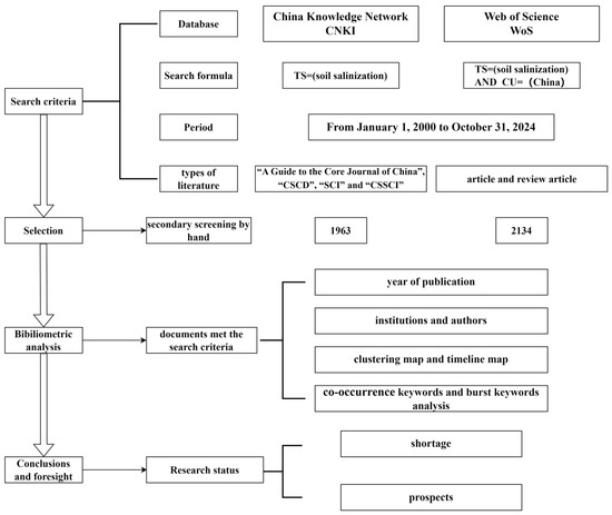 The English literature data were obtained from the Web of Science (WoS) Core Collection database. This study performed a full-field search with ((TS = soil salinization) AND CU = (China)) as the subject term and the time limit from 1 January 2000 to 31 October 2024, and the types of literature were articles and review articles. By removing irrelevant and duplicated literature, a total of 2134 valid literature data were obtained.