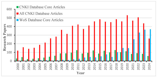In general, the CNKI database’s total literature annual publication volume shows an increasing trend year by year, but there is some fluctuation after 2016. In the past ten years, the annual publication volume of related literature has been stable at about 500 articles. However, the change in the annual publication volume of core journals is divided into three stages. During the period 2000–2011, the number of articles issued showed a rising trend year by year, and the number of articles issued in the period 2011–2018 showed volatility but remained stable. In the second phase, there is a slight increase in the number of articles compared with the first phase, but the magnitude is not significant. In the 2018–2024 phase, there is a certain downward trend in the number of articles issued, but the magnitude is small.