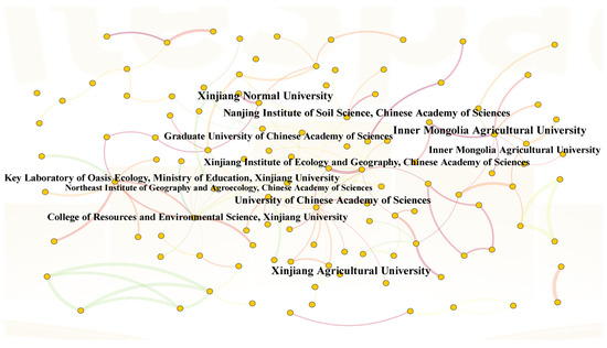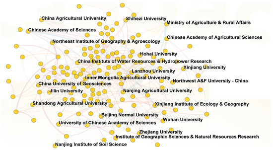 Figure 3 and Figure 4 show the characteristic of “small concentration, large dispersion”, which not only demonstrates the close cooperation network among research institutions in the field of salinization research but also highlights the important role of cross-institutional cooperation in promoting scientific progress in this field. The main research forces include universities and their affiliates such as China Agricultural University, Northwest Agricultural and Forestry University, Xinjiang University, and Inner Mongolia Agricultural University, as well as research institutes such as the Chinese Academy of Agricultural Sciences (CAAS), Nanjing Soil Research Institute of the Chinese Academy of Sciences (NARAS), and Xinjiang Institute of Ecology and Geography of the Chinese Academy of Sciences (XIEG). There is a clear correlation between the research institutions with high publication volume and the geographical distribution of saline soil, especially in the key areas of inland saline soil in the North China Plain, irrigation-induced saline land in the Hetao Plain, inland arid areas of Soda saline, and other priority areas.