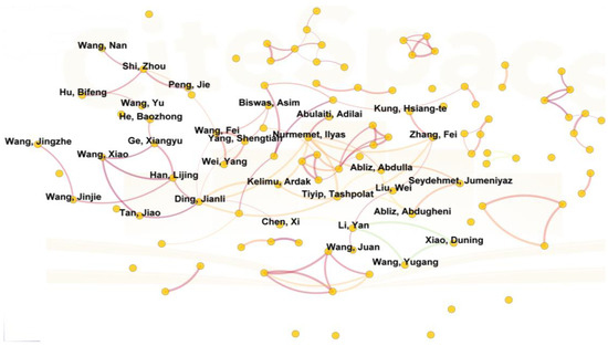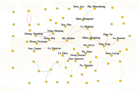 Upon analyzing the information from the CNKI database, CiteSpace identified a total of 279 authors to examine the general trends in their interrelationships. These authors were connected through 253 collaborative interactions, leading to a network density of 0.0065. As depicted in Figure 5, most authors engaged in frequent collaborations, forming “big circles” centered on Shi Haibin and numerous “small circles” where they worked closely.