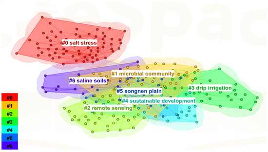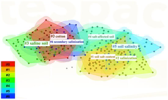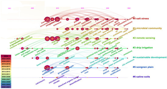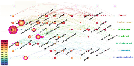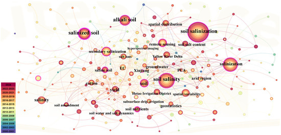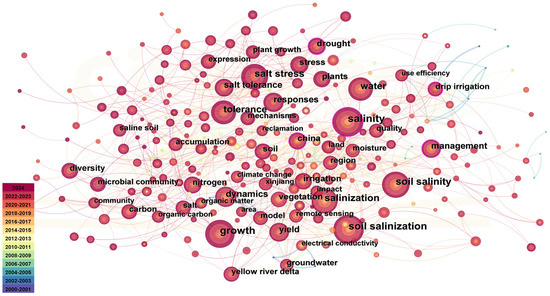 The high frequency of “salinity”, “salinization”, “soil salinization”, “soil salinity”, “primary salinization”, and “secondary salinization” indicate that researchers are committed to understanding the processes and mechanisms of soil salinization in terms of salt content [51]. The emergence of keywords such as “growth”, “salt stress”, and “tolerance” suggests that plant growth response and adaptation mechanisms in salinized soils are a focus of research [52]. In addition, the presence of “water”, “dynamics”, “Yellow River Delta”, and “management” indicates that researchers are exploring effective soil salinity management strategies from different regions and in different ways [53,54].