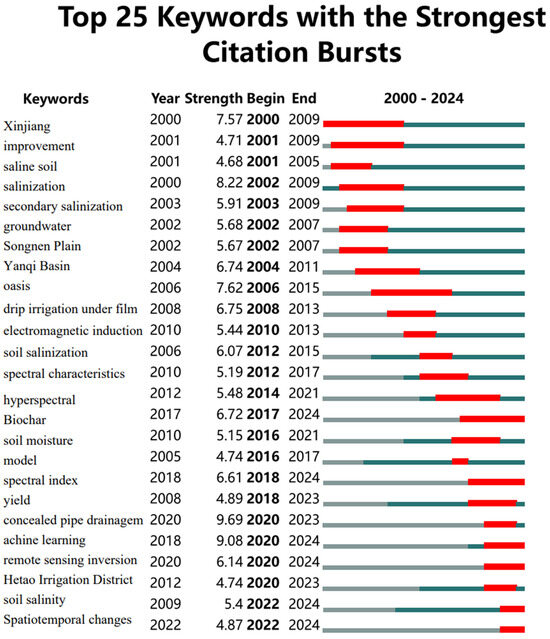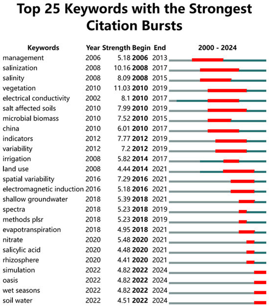 (2) 2016–2024: Long-burst keywords for this phase include “land use” spatial variability”, and “electromagnetic induction”. The keywords “spectra” and “methods plsr” have a short duration, while “rhizosphere”, “simulation”, “oasis”, “wet seasons”, and “soil water” have become highly prominent in recent years. These keywords reveal that salinity research is carried out from several key areas. These areas relate to spatial and temporal variability of soil salinity, related monitoring techniques, hydrological processes, plant interactions, and modeling and prediction methods.