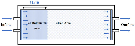 The mathematical model for simulating the driving of remedial fluid in the presence of transverse flow is also derived from the convection–dispersion equations (Equation (1)) and the boundary conditions (Equations (4), (5), (7) and (8)).