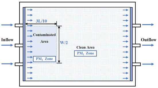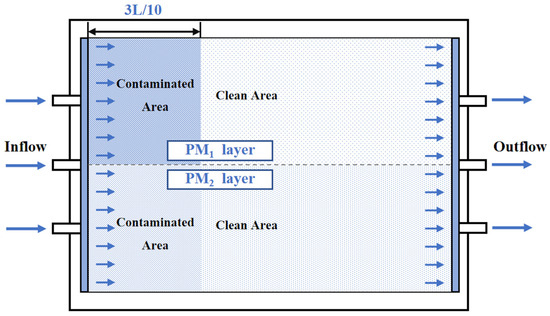 The experimental apparatus was a rectangular tank made of Plexiglas with internal dimensions of 500 mm × 360 mm × 34 mm (Figure A1). A contaminated strip media system, representing a dual-permeability system, was simulated, with the arrangement of the structure shown in Figure 2. The experimental procedures followed those used for the single-permeability system. During the experiment, the movement of the remedial fluid front in each media layer was recorded. Once the fluid had advanced to half the length L in the higher-permeability media (PM1), the PCE concentrations in both media layers were measured.