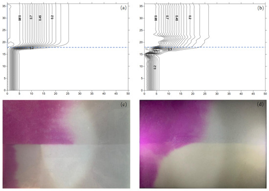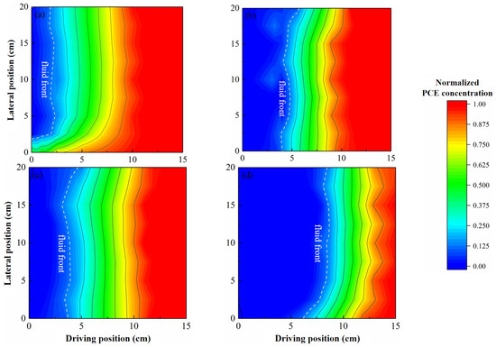 Under varying injection conditions (X-KM (0) vs. X-KM (0.4)), the concentration distribution of PCE in the contaminated area of the lower-permeability layer (refer to Figure 1 for the configuration) is shown in Figure 4. The initial PCE concentration is normalized to 1. The injection time corresponds to the duration required for the fluid to displace half of the length L within the higher-permeability layer (see Xu et al. [39] for additional details). As illustrated in Figure 4c,d, when a viscous mixture is injected, the concentration of PCE within the porous media layer (sand F) exhibits a marked reduction compared to the X-KM (0) injection (Figure 4a,b), as evidenced by the expansion of the blue region.
