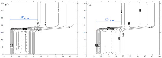 Figure 5 illustrates the simulation of PCE removal in the porous media layers under no cross-flow conditions. Compared to the X-KM (0) solution injection (Figure 5a), the X-KM (0.4) injection, which incorporates the hydraulic conductivity adjustment mechanism, exhibited a more pronounced precursor front in the removal of PCE from the lower-permeability layer (sand F) (Figure 5b). A notable reduction in the distance between the complete PCE removal fronts in the higher- and lower-permeability layers was observed (i.e., ∆D′PCE0 < ∆DPCE0). These results suggest that the addition of xanthan gum mitigated the preferential flow effect of the remedial agent, enhancing the removal of PCE in heterogeneous layers.