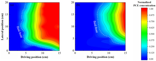 During the X-KM (0.4) injection, under conditions of transverse flow movement, the distribution of PCE in the contaminated area of the lower-permeability layer is illustrated in Figure 7, where the remedial fluid was driven halfway through the higher-permeability layer. The configuration is referenced in Figure 2. Compared to the PCE removal observed in Figure 4c,d, the removal rate in the contaminated area of the lower-permeability layer was significantly enhanced due to the influence of transverse flow movement. Specifically, for the C-F combination, the removal rate increased from 48.1% to 52.1%, while for the M-F combination, it increased from 68.7% to 76.8%. The transverse flow movement facilitated the migration of the remedial fluid from the higher-permeability layer into the adjacent fine sand, thereby improving the overall remediation efficiency. Furthermore, it is evident that the M-F sand combination, characterized by a lower permeability contrast (Figure 7b), exhibited a more pronounced transverse flow effect compared to the C-F combination (Figure 7a), as indicated by the transverse displacement of the blue advanced front. These observations are consistent with the findings of Xu et al. [39].