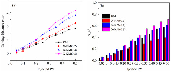 As illustrated in Figure 8a, the addition of xanthan enhanced the displacement of remedial fluid within the lower-permeability layer. When equal volumes of remedial fluid were injected, the overall driving distance of the viscous mixture was greater than that of the X-KM (0) solution, with the driving distance gap between the two increasing progressively throughout the injection process. Additionally, the driving efficiency of the remedial fluid in the lower-permeability layer exhibited a positive correlation with xanthan gum concentration. For instance, when the injection volume was 0.5 PV, the driving distance of the viscous mixture increased by 1.6 cm, 3.8 cm, and 5.2 cm, respectively, after the addition of xanthan gum at concentrations of 0.2 g/L, 0.4 g/L, and 0.8 g/L, compared to the X-KM (0) injection. This effect can be attributed to the increased resistance to fluid flow in the higher-permeability layer induced by the addition of xanthan, which facilitated a greater volume of fluid flow into the adjacent lower-permeability layer.