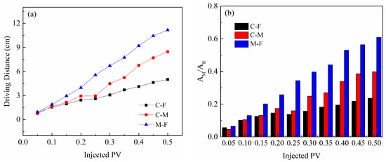 As shown in Figure 9a, the driving distance of the viscous fluid in the LPZ exhibited significant differences across porous media combinations with varying permeability contrasts. Among these, the M-F combination demonstrated the most effective driving, with the difference in driving distances between the three porous media combinations increasing notably with continued injection. After injecting 0.5 PV of fluid, the driving distance of the remedial fluid in the LPZ of the M-F combination reached 11.2 cm, which was substantially greater than that observed in the C-M combination (5.0 cm) and C-F combination (8.5 cm). According to previous studies, the hydraulic conductivities of the viscous mixture X-KM (0.4) in sand C, sand M, and sand F were 108, 16.8, and 3.4 m/day, respectively [39]. Accordingly, the permeability contrasts of the viscous fluid in these three combinations were 4.9 (M-F combination), 6.4 (C-M combination), and 31.8 (C-F combination), respectively. It is hypothesized that a smaller permeability contrast between the two media facilitates a greater volume of remedial fluid flowing into the LPZ, thereby enhancing the driving effect of the remedial fluid in that region.