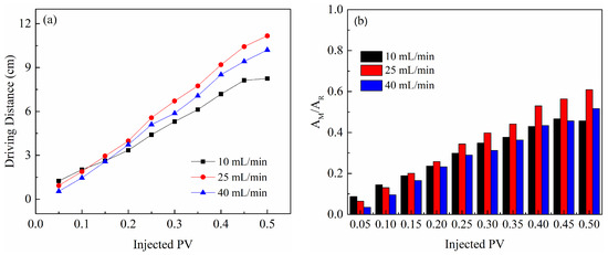 The effect of the injection rate on the driving of remedial fluid in the LPZ exhibited a fluctuating trend (Figure 10a). At an injection rate of 10 mL/min, after injecting 0.5 PV of fluid, the driving distance of the remedial fluid in the LPZ was 8.2 cm. When the injection rate increased to 25 mL/min, the driving distance increased by 3 cm. However, further increasing the injection rate did not result in a significant enhancement of the driving effect, as the driving distance only reached 10.2 cm at an injection rate of 40 mL/min.