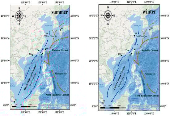 - Song, N.; Gao, T.; Ying, Y.; Yanagimoto, T.; Han, Z. Is the Kuroshio Current a strong barrier for the dispersal of the gizzard shad (Konosirus punctatus) in the East China Sea? Mar. Freshw. Res. 2016, 68, 810–820. [Google Scholar] [CrossRef]