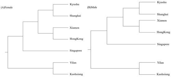 Hierarchical clustering dendrogram depicting the relationships among seven sampling areas for the female dataset (A) and male dataset (B).