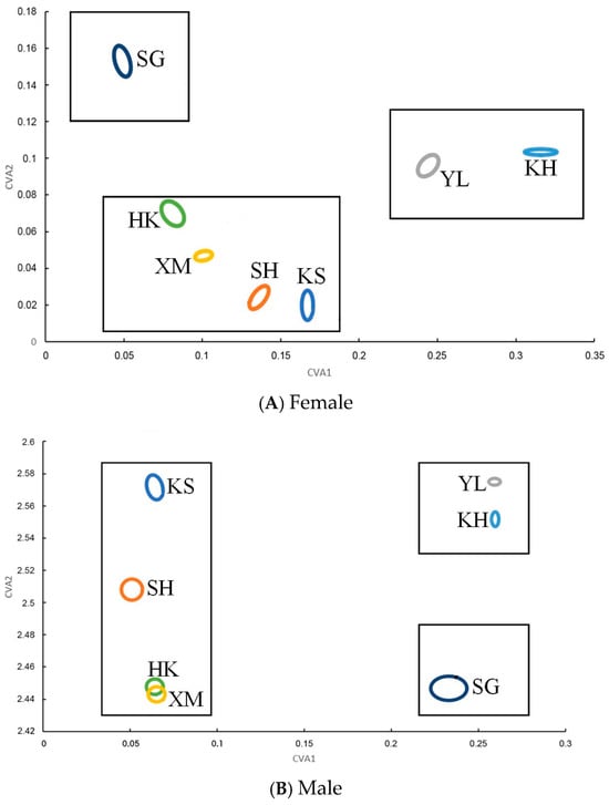 Graphical representation of 95% confidence ellipses surrounding sample distributions and group means of the first three canonical scores for (A) females and (B) males, categorized into the Northeast Asian group (NAG), Southeast Asia group (SAG), and Kuroshio tributary group (KTG). Notes: Kyushu (KS), Shanghai (SH), Xiamen (XM), Hong Kong (HK), Yilan (YL), Kaohsiung (KH), and Singapore (SG).