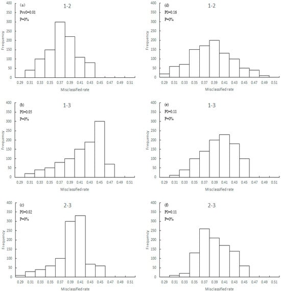 Frequency distribution of 1000 misclassification rates (Pc) estimated from (a) the Kuroshio tributary group (KTG) for females, (b) the Northeast Asian group (NAG) for females, (c) the Southeast Asia group (SAG) for females, (d) the Kuroshio tributary group (KTG) for males, (e) the Northeast Asian group (NAG) for males, and (f) the Southeast Asia group (SAG) for males. P represents the proportion of Pc < Po among 1000 permutations, while Po denotes the misclassification rate estimated from the original dataset.