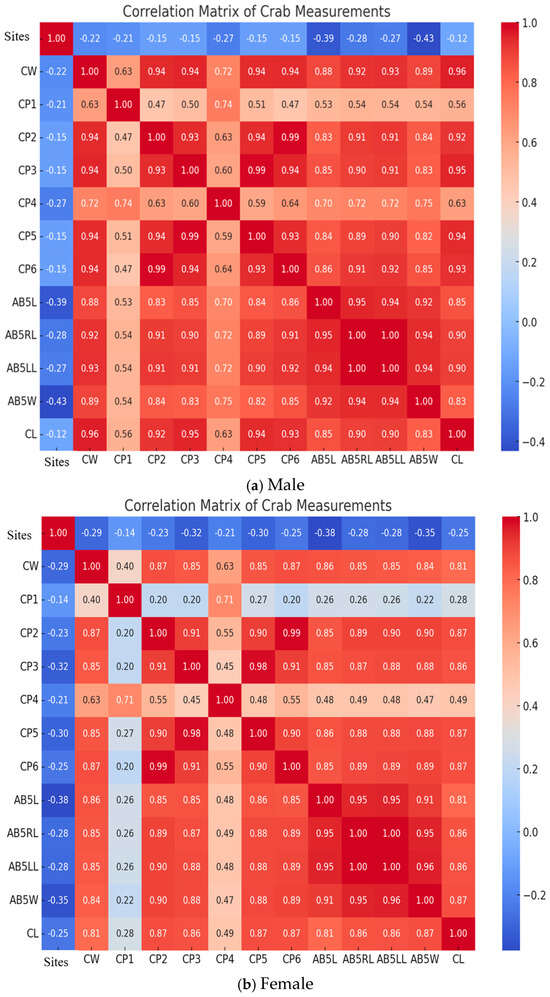 where Yi represents the standardized measured length of the ith specimen, Yi denotes the measured length of the ith specimen, Xi refers to the measured carapace length of the ith specimen, and represents the average value of the carapace lengths observed in the specimens analyzed. In summary, b is a critical exponent that governs the scaling process, facilitating the removal of size effects and enhancing the reliability of the correlation analysis between characteristics Y. The canonical variate analysis (CVA) identified morphological traits contributing to population differentiation and visualized group separation. Morphometric analyses, performed using MorphoJ software, included CVA and UPGMA clustering based on Mahalanobis distances. CVA and hierarchical clustering were selected for their complementary strengths in morphometric analyses. CVA effectively discriminates between predefined groups while maximizing between-group variation relative to within-group variation, making it particularly suitable for detecting subtle morphological differences between populations [10,36]. Hierarchical clustering provides an objective method for identifying natural groupings in morphometric data without a priori assumptions about population structure [36]. Together, these methods offer robust validation of population differentiation through independent analytical approaches. A randomization test with 5000 iterations assessed the significance of differences and misclassification rates [10,14,32,39,40]. A heatmap of the correlation matrix highlighted key traits driving variation in C. feriatus morphology. The correlation matrix heatmap provides a visual representation of the strength and direction of relationships between morphometric traits, with color intensity indicating correlation magnitude. This visualization technique helps identify patterns of trait covariation and highlights key morphological relationships that might not be apparent in traditional correlation tables.
