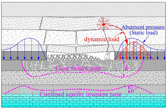Most mining regions in China will transition to deep mining as a result of the ongoing depletion of shallow coal deposits and continued increases in mineral consumption. In deep mining environments, FWI accidents are often triggered by the high water pressure of Ordovician limestone formations, a major aquifer, and pose significant water inrush risks during mining in the North China coalfields [1]. Statistically, more than 60% of FWI accidents happen during the periods of first and roof periodic weighting at the working face [2,3]. Some typical FWI accidents are listed in Table 1. The explanation for these accident regularities can be obtained by analyzing the stress conditions of the mining floor. First, the abutment pressure on the floor induced by mining activities peaks prior to the roof weighting. Furthermore, during these periods, the floor is subjected to extra dynamic loads induced by roof breakage, leading to enhanced disturbance and an increase in FDMF [4,5]. The schematic of loading is shown in Figure 1.