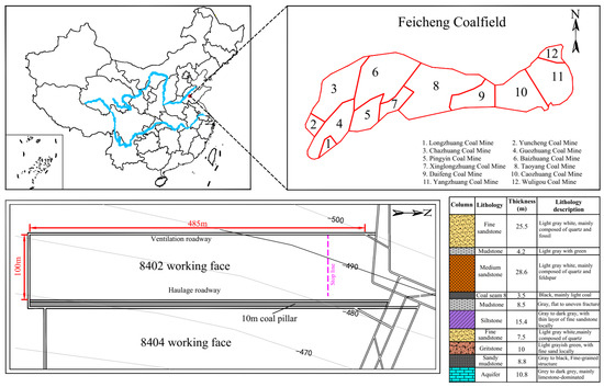 The study was conducted in a coal mine situated in the Feicheng coalfield of Shandong Province, China. The 8402 working face is the first mining face in the No.8 coal seam, with the adjacent 8404 working face to the east remaining unmined. The No.8 coal seam has a thickness ranging from 2.7 to 4.3 m (averaging 3.5 m) and a dip angle of 0° to 5° (averaging 3°). The coal seam is nearly horizontal, with a burial depth of 531~560 m. The layout plan of the working face and the stratigraphic column of the roof and floor are illustrated in Figure 2. The roof rock layer primarily consists of fine sandstone and medium sandstone, both exhibiting high strength. The immediate roof is medium sandstone with a thickness ranging from 19.5 to 36.8 m, and an average thickness of 28.6 m. Due to the high integrity and strength of the overlying hard-thick sandstone roof, the immediate roof resists fracturing even under large-area exposure. Owing to the large thickness and high tensile strength of the immediate roof, the roof weighting exhibited extremely violent. The first weighting step of the roof was 36 m, while the periodic weighting distance was approximately 22 m.