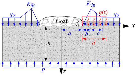 As illustrated in Figure 1, the loads acting on the mining floor primarily include the static load of abutment pressures and dynamic load generated by roof breakage during roof weighting. In previous studies, most scholars considered only the abutment pressure. However, the dynamic load accompanied by overlying roof strata fracturing and caving also affected the stress state of the floor. In this study, the stress components of the mining floor, considering the combined effects of dynamic and static loads, were calculated using the simplified mechanical model depicted in Figure 3.