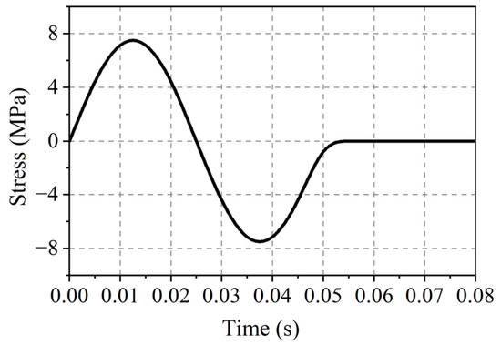 According to the actual mining data and in situ measurement results of the working face, the parameters of the floor stratum are averaged, the modulus of elasticity E = 16.6 GPa, Poisson’s ratio , and density . The roof first weighting step is 36 m, so a = 18 m. The stress increasing zone length b = 10 m, stress decreasing zone length c = 20 m, γH = 10 MPa, stress concentration coefficient K = 2.5, and the water pressure P = 3 MPa. The dynamic load parameters acting on the floor are , , . The dynamic load action calculation time is 0.08 s, action range d = 20 m, and the dynamic load stress time–history curve is shown in Figure 4.