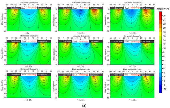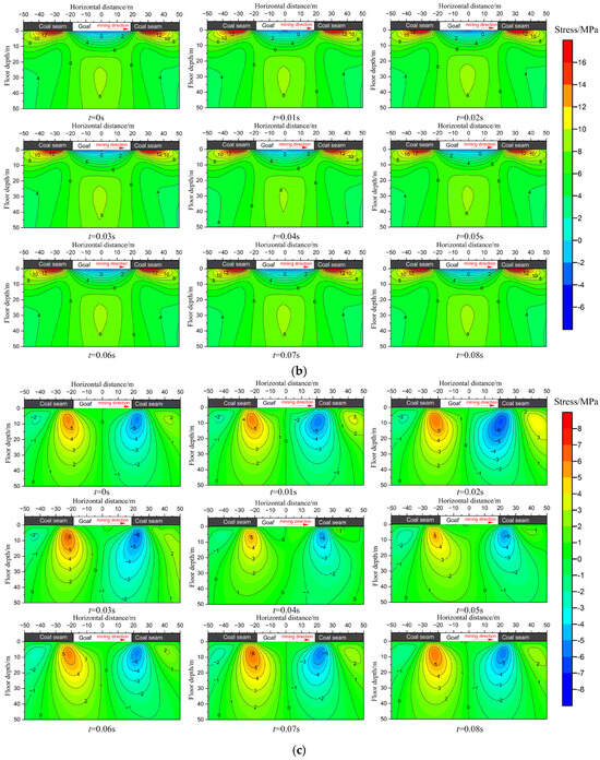Stress distribution of the floor at different loading times (unit: MPa). (a) Vertical stress. (b) Horizontal stress. (c) Shear stress.