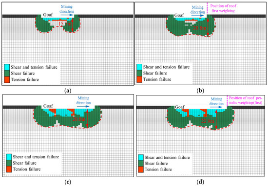 Plastic zone distribution in the floor at different mining stages. (a) Advance 36 m, before roof first weighting; (b) after roof first weighting; (c) advance 58 m, before roof periodic weighting (first); (d) after roof periodic weighting (first).