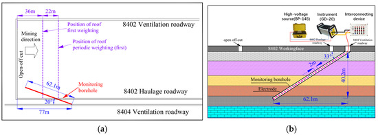 To accurately measure the FDMF of the 8402 working face at various mining stages, borehole resistivity measurements were carried out in the ventilation roadway of the adjacent 8404 working face. The construction and layout of the borehole are illustrated in Figure 9. For the field measurement, a 91 mm diameter borehole was drilled into the floor at a distance of 77 m from the open-off cut. The tests were conducted using the GD-20 electrical measurement system. It includes one operating instrument, a high-voltage source, and an interconnecting device. The electrodes were placed in the borehole and coupled with the surrounding rock by injecting cement slurry.