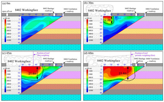 When the working face advanced to 30 m, a notable increase in the resistivity was observed in the floor rock masses of the mined area (Figure 10b). The resistivity at depths of 0 to 12.2 m was 3 to 5 times higher than the background values. As mining progressed, the maximum resistivity in this zone reached 1582 Ω⋅m. The expansion of the high-resistivity region indicated significant disturbance and damage to the floor strata caused by mining activities. At this stage, the coal mining face was still 6 m away from the position of the first roof weight, and the maximum FDMF was approximately 12.2 m.