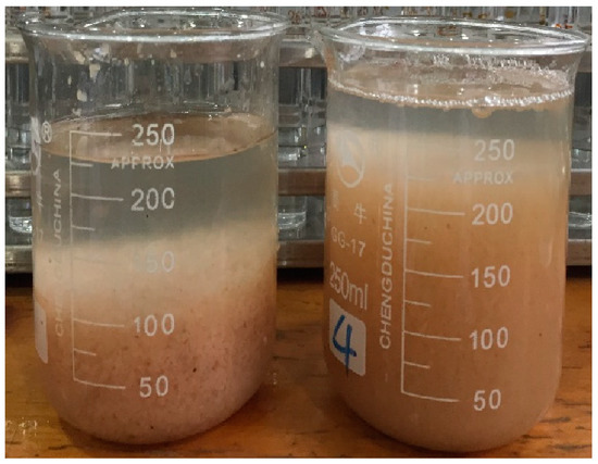 Table 2, the original settlement velocity of the AGS was 30 m/h, and after adding the CPAM, its settlement velocity increased to 39 m/h. Similarly, the original settlement velocity of the AS was 5 m/h, and after adding the CPAM, its settlement velocity increased to 2.4 times the original, namely 12 m/h. When the AGS and AS were mixed in a 1:1 ratio (dry sludge weight), the settlement velocity of the mixed sludge exhibited more complex behavior. The original settlement velocity of the mixed sludge was 19 m/h, and after adding the CPAM, its settlement velocity increased to 26 m/h. This result indicated that the settlement velocity of the mixed sludge was not simply a linear combination of the settlement velocities of the two types of sludge but was influenced by lots of factors. The particle size of the AGS and the floc strength of the AS were key factors that affected the mixing effect. The AGS particles could be encapsulated by the flocs of the AS, or vice versa, and the two could form larger aggregates. In this case, the settlement velocity of the mixed sludge could increase. However, it was also possible that the two types of sludge may interfere with each other, leading to a decrease in the settlement velocity.