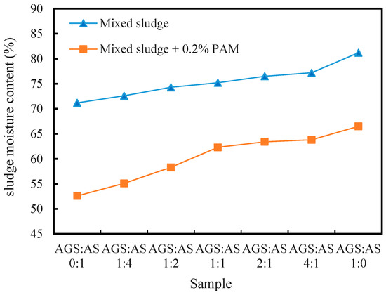 When different proportions of the un-dewatered AS were blended into the AGS, the moisture content of the resulting dewatered sludge cake dropped from 81.2% to 72.6%. This indicated that the addition of the AS changed the composition and characteristics of the AGS sludge, which potentially promoted the aggregation and sedimentation of sludge particles and further enhanced the dewatering efficiency.
