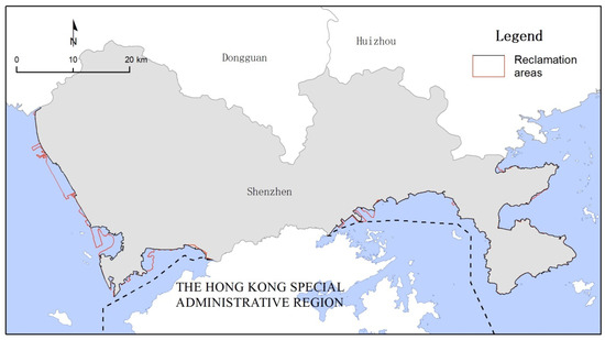 Distribution map of reclamation areas in Shenzhen.(Blue represents the sea, white represents the land, and gray represents the land of Shenzhen).