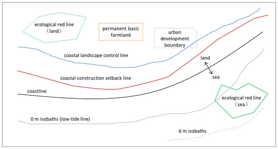 Usually, eight lines can be delineated in coastal areas, namely the ecological red line, permanent basic farmland, and urban development boundary control lines, as well as the coastal landscape control line, coastal construction setback line, coastline, 0 m isobaths (low-tide line), and 6 m isobaths management lines (Figure 5). Among them, the three control lines are designated by the national organization, and the control rules are relatively mature and clear. Local governments are mainly responsible for implementing them. Permanent basic farmland and urban development boundaries are usually not delineated across the coastline into the sea area. In order to protect the natural landscape of the city and the artificial landscapes, such as buildings, roads, and open spaces, formed through long-term planning and construction, it is necessary to establish a coastal landscape control line with the main purpose of maintaining the coastal landscape. The 6 m isobath is the outer boundary of coastal wetlands, and the sea area between it and the coastline plays an important role in ensuring the habitat, foraging, and migration of birds. In the future, the coastal zone should focus on the five management lines themselves, especially implementing differentiated control over the area between the coastal construction setback line and 0 m isobaths, scientifically setting constraints for planning and construction.