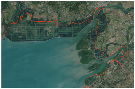 Typical case of the distribution of ponds outside the coastline (the red line represents the coastline announced by the government).