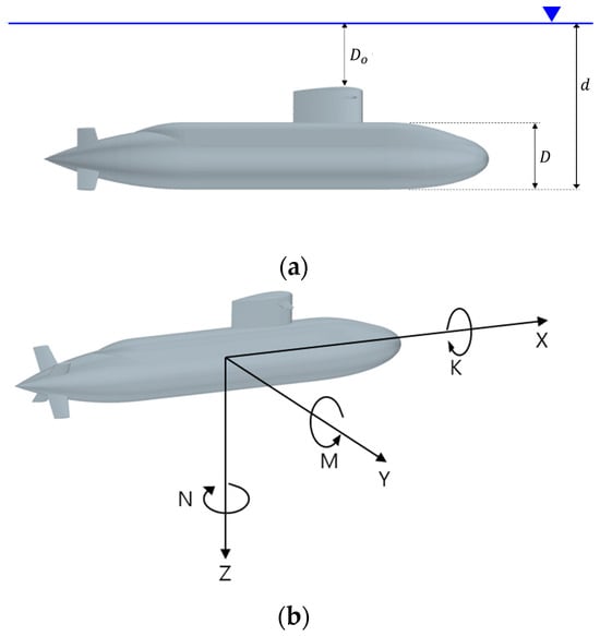 Submarine design has undergone significant advancements over the past few centuries, beginning with the French Navy’s introduction of a diesel-powered submarine in 1863. Early submarine designs featured hull shapes similar to those of surface vessels. However, to reduce hydrodynamic resistance and enhance speed for tactical advantages, hull forms evolved into more streamlined and rounded shapes []. Modern submarines are primarily optimized for submerged operations, as they operate predominantly underwater. Nevertheless, they must also function near the free surface in scenarios such as snorkel operations and surface piercing. Under these conditions, reduced speeds are often required to minimize the risk of detection, which consequently impacts the vessel’s maneuverability and control [].